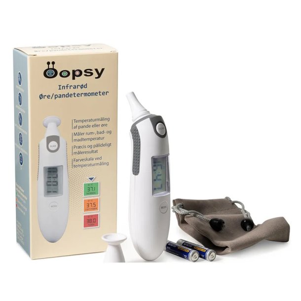 Infrarød termometer fra Oopsy til måling af temperatur via pande eller øre.