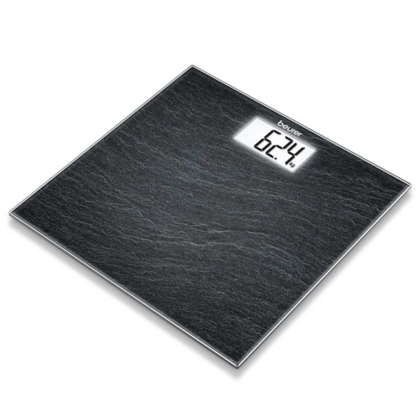 GS 203 glasvægt i et moderne skifer design, som har et ekstra stort, hvidt baggrundsbelyst LCD display med en cifferstørrelse på 40 mm.