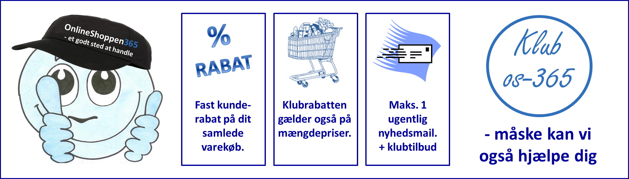 Du kan blive medlem af Klub OS-365 ved at tilmelde dig vores nyhedsmail. Når du har tilmeldt dig nyhedsmailen, så sendes der automatisk en velkomstmail med din medlemskode til den email der er oplyst. Ellers er der ingen forpligtelser - men kun fordele :-)