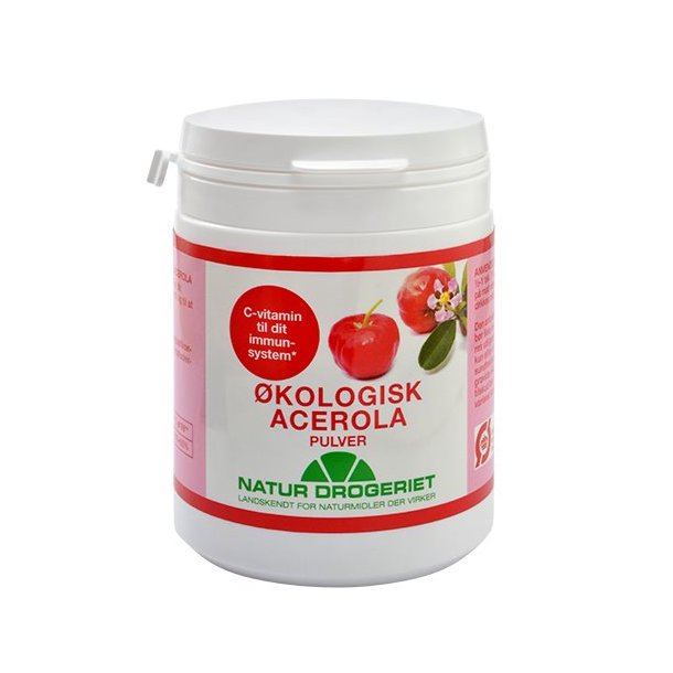 Økologisk Acerola-pulver med 17 % C-vitamin. Den lille Acerola-frugt er rød og ligner et kirsebær, men til forskel fra kirsebær er smagen af acerola meget syrlig.